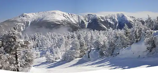 ![]() Mount Lafayette as viewed from Franconia Ridge. Hikers are visible hiking through the krummholz in the col. | |