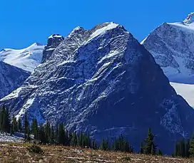 Mount Topham, is a 2,872-metre (9,423-foot) mountain summit located in Glacier National Park of British Columbia, Canada. It is part of the Selkirk Mountains range.[1] The mountain is a remote 60 km (37 mi) east of Revelstoke, and 32 km (20 mi) southwest of Golden. Its nearest higher peak is Mount Selwyn, 2.66 km (1.65 mi) to the west.[1] Mount Topham is situated along the western edge of the Deville Glacier. Precipitation runoff from the mountain drains into the Beaver River. Mount Topham was named in 1902 by Arthur Oliver Wheeler to honor Harold Ward Topham (1857–1915), an English mountaineer who explored and mapped the Selkirks.[5] The mountain's name was officially adopted September 8, 1932, by the Geographical Names Board of Canada.[4] Based on the Köppen climate classification, Mount Topham is located in a subarctic climate zone with cold, snowy winters, and mild summers.[6] Winter temperatures can drop below −20 °C with wind chill factors below −30 °C.