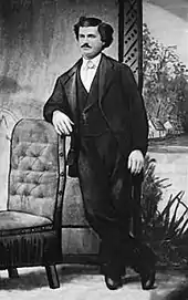 Initial published reports of the incident date back at least to October 1857 in the Los Angeles Star.[55][56] A notable report on the incident was made in 1859 by Carleton, who had been tasked by the U.S. Army to investigate the incident and bury the still exposed corpses at Mountain Meadows.[15] The first period of intense nationwide publicity about the massacre began around 1872 after investigators obtained Klingensmith's confession. In 1868 C. V. Waite published "An Authentic History Of Brigham Young" which described the events.[57] In 1872, Mark Twain commented on the massacre through the lens of contemporary American public opinion in an appendix to his semi-autobiographical travel book Roughing It.[58] In 1873, the massacre was given a full chapter in T. B. H. Stenhouse's Mormon history The Rocky Mountain Saints.[59] The massacre itself also received international attention,[60][61] with various international and national newspapers also covering John D. Lee's 1874[62] and 1877 trials as well as his execution in 1877.[63][64]