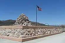 In 1955, to memorialize the victims of the massacre, a monument was installed in the town square of Harrison, Arkansas. On one side of this monument is a map and short summary of the massacre, while the opposite side contains a list of the victims.[126] In 2005 a replica of the U.S. Army's original 1859 cairn was built in the community of Carrollton, Arkansas,[127] the former county seat of Carroll County, Arkansas.[128] it is maintained by the Mountain Meadows Monument Foundation.[127][129]