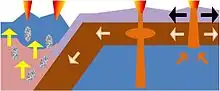 Movements of tectonic plates create volcanoes along the plate boundaries, which erupt and form mountains. A volcanic arc system is a series of volcanoes that form near a subduction zone where the crust of a sinking oceanic plate melts and drags water down with the subducting crust.[9]