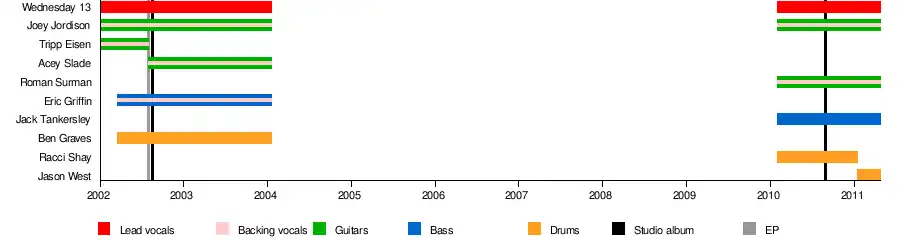 Murderdolls was an American rock band formed in Hollywood, California in 2002.[3] Its lineup consisted of core members Wednesday 13 and Joey Jordison while former touring members included Ben Graves, Acey Slade, Eric Griffin and Tripp Eisen.