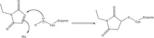 NEM is a Michael acceptor in the Michael reaction, which means that it adds nucleophiles such as thiols. The resulting thioether features a strong C-S bond and the reaction is virtually irreversible. Reaction with thiols occur in the pH range 6.5–7.5, NEM may react with amines or undergo hydrolysis at a more alkaline pH. NEM has been widely used to probe the functional role of thiol groups in enzymology. NEM is an irreversible inhibitor of all cysteine peptidases, with alkylation occurring at the active site thiol group (see schematic).[3][4]