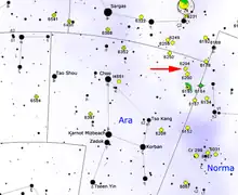 NGC 6204 is an open cluster in the constellation Ara, lying close to the galactic equator.[3] It is 3,540 ly (1,085 pc) distant from Earth. The cluster was discovered on 13 May 1826 by British astronomer James Dunlop.[4]