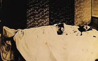 Shimazu was heading in the opposite direction to Lennox and his party, who continued to ride along the side of the road without dismounting until they reached the main body of the procession, which occupied the entire width of the road. Richardson, leading his party, rode close to Shimazu's procession and did not dismount despite being gestured repeatedly to do so. Richardson was subsequently slashed and mortally wounded by one of the Satsuma bodyguards. Clark and Marshall were also severely wounded by the Satsuma but Borrodaile was not harmed, and the three rode away as fast as they could. Richardson fell from his horse and Shimazu gave the order for todome — the coup de grâce — to be given, with several samurai proceeding to hack and stab at Richardson with swords and lances.[3] A post-mortem examination of Richardson's body showed ten mortal wounds, and he was buried in the Yokohama Foreign General Cemetery, between the later graves of Marshall and Clark.[1][2]