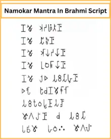 A short inscription (dated 200 BCE to 100 BCE) found in Pale Caves in Maharashtra mentions Namo Arahatanam (नमो अरहतानं) or Namo Arahantanam (नमो अरहंतानं), only the first line of Namokara Mantra. In Kushana and Shaka periods of 1st century CE to the first quarter of 2nd century, only the first line was prevalent.[3] The Hathigumpha inscription dated between 2nd century BCE to 1st century CE starts with Namo Arahantanam (नमो अरहंतानं) and Namo Save Sidhanam (नमो सवे सिधानं), the first two lines of Namokar Mantra. The rest of the lines are not there. It was inscribed by the Jain monarch Kharavela of Kalinga kingdom.[3][4][5] According to historian M. A. Dhaky, these two lines were originally used as mangala (auspicious opening lines) in written works and rituals then.[3] The Namaskara Mantra with all Pañca-Parameṣṭhi (five supreme souls) was first mentioned in the auspicious opening lines in the condensed edition of Vyākhyāprajñapti. This version also replaces Ardhamagadhi नं with Maharashtrian Prakrit णं.[3] In condensed edition of Avashyakasutra (dated circa last quarter of 5th century), the नं is also replaced with णं as well as अरहंत (Arahant) with अरिहंत (Arihant). Shatkandagam (circa 475-525 CE) and later Visheshavashyakbhashyavritti (circa 725 CE) and Anuyogadwarasuchi shows नमो (Namo) replaced with more Prakit णमो (Namo). Composed around the beginning of the Common Era, Chattarimangalam Stotra mentions only Arhat, Siddha, Sadhu and Kevalipragnapti Dharma (Dharma as prescribed by Omniscients) as four chief auspicious. So the three lines regarding Acharya, Upadhyaya and Sadhu must have been added later. The last four lines about phala-prashashti (benefits of chanting) are not older than 6th century CE and are not found in any older works, according to Dhaky.[3] The importance of it as a mantra in texts, traditions, rituals and meditation arose thereafter.[3]