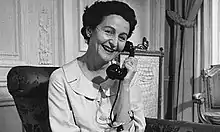 In April 1940, Mitford suffered her second miscarriage. Shortly afterward, Rodd, who had been commissioned into the Welsh Guards, departed overseas.[86] Alone in London, Mitford moved to the family's Rutland Gate house where she remained during the London Blitz. The main house had been requisitioned to provide a refuge for Jewish families evacuated from the bombed areas of the East End. Mitford spent much of her time looking after those families: "so hard-working, clean and grateful".[87] A brief affair with a Free French officer, André Roy, resulted in a third pregnancy. Mitford again miscarried, with complications that led, in November 1941, to a hysterectomy.[88] After convalescence, at loose ends, she began working as an assistant at the Heywood Hill bookshop in Curzon Street.[n 9] The shop became the centre of Mitford's daily activities and was a favoured meeting place for London's literati.[90] In September 1942, she met Gaston Palewski, a French colonel attached to General Charles de Gaulle's London staff. She found him fascinating, and he became the love of her life though her feelings were never fully reciprocated. He was an inspiration for much of her future writing. For the sake of Mitford's reputation, the affair was pursued with discretion before Palewski left for Algeria in May 1943. Thereafter, the relationship was conducted mainly by letters and occasional phone calls since Palewski was only intermittently in England before the end of the war.[91]
