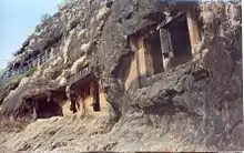 | This is a group of chambers, probably the remains of three bhikshugrihas or hermitages, with one, two, and three cells respectively. The first has an inscription of a certain Hamanaka, mentioning an endowment of 100 karshapanas for "a garment to the ascetic residing in it during the rains". To the left is a tank, and then for thirty yards everything has been blasted and quarried away.[9]
