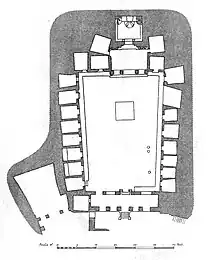 The façade has four octagonal pillars between antae, the shafts more slender than in any of the other caves, but the bases of the same pattern disproportionately large, as if the shafts had been reduced in thickness at a later date. They stand on a paneled base, with five low steps up to it between the middle pair. A low screen wall in front is nearly quite destroyed, except at the east end, where a passage led to a large irregular and apparently unfinished apartment with two plain octagonal pillars with square bases between pilasters in front, and having a water-cistern at the entrance.[45]