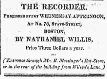 Back in Boston in 1816, Willis established The Recorder newspaper, "published every Wednesday afternoon at no.76 State-Street, ... entrance through Mr. H. Messinger's Hat-Store or in the rear of the building from Wilson's Lane".[6] Associates included Sidney E. Morse.[7] He later moved to Congress Square.[8] Willis sold the paper to Martin Moore in 1844.[3]
