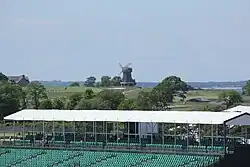 Some of the other holes were original designs, the most notable of which is the par four 14th hole. It was named "Cape" because the green was located on a small peninsula that jutted into a bay. The green was later moved during construction of Sebonac Inlet Road but is now surrounded on three sides by a large bunker.[17] A unique feature on the golf course is a windmill located between the 2nd and 16th holes. A member once remarked that a windmill would make a nice addition to the course, so Macdonald purchased one when he was in Europe and sent the member the bill.[18]