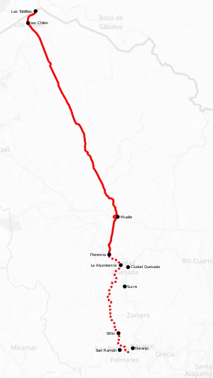 In Alajuela province the route covers San Carlos canton (Florencia, Cutris, Pocosol districts), Los Chiles canton (Los Chiles, El Amparo, San Jorge districts).
