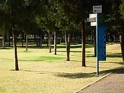 One of the best-known areas of Naucalpan is Ciudad Satélite with its signature Torres de Satélite sculpture. Ciudad Satélite was one of a number of large scale projects undertaken by the federal government in the Mexico City area in the 1950s and 1960s, along with the Conjunto Habitacional de Tlaltelolco and the Ciudad Universitaria.[17] From the late 1940s to early 1950s, Mexico City began to grow towards the northern limits of the Federal District, and compelling urbanization into adjoining Mexico State. One of the projects conceived for the suburban zone of Naucalpan was a development called Ciudad Satélite. The project was headed by architect Luis Barragán in 1958 and financially backed the Banco Internacional Hipotecario.[18] The city's design and coordination was supervised by architect Mario Pani. It was designed to be a suburban community with a "green corridor" (highway lined by parks) connecting it to Mexico City proper. Attractive land prices created a boom market soon after the first units were sold in the mid 1960s, and over the next ten years, the green corridor disappeared.[17] In addition to being a major bedroom community, it has been a major shopping district since the opening of the Centro Comercial Satélite in 1962.[3]