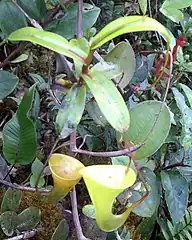 In his description of the Bornean species N. campanulata, botanist Shigeo Kurata suggested that it may be closely related to N. inermis.[19] However, other taxonomists disagree with this hypothesis.[20] While these two species are similar in general stature and pitcher morphology, they are not only separated by great geographical distance, but also occur in completely different habitats; N. campanulata is a lowland species endemic to limestone substrates,[21] whereas N. inermis usually grows as an epiphyte at elevations of 1,500–2,600 metres (4,900–8,500 ft).[7][22]