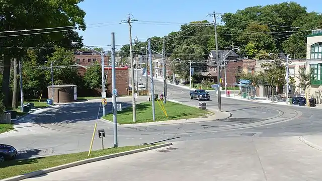 The original loop was located completely off-street at the north-west corner of Queen Street and Nursewood Road; that is, the loop did not touch Nursewood Road. However, in 1967, the TTC rebuilt the loop into Nursewood Road at a larger radius in order to accommodate two-car, multiple-unit PCC trains which operated through the loop for 10 years. The rebuilt loop had a longer off-street area to hold an entire PCC-train.[3][6]