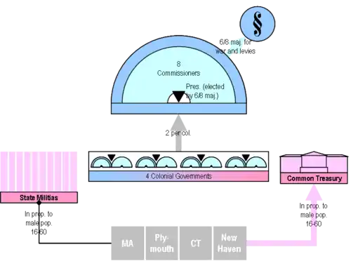 - No member colony was to undertake any act of war or conflict without the consent of the others. This would be to prevent smaller provinces from being forced to engage in a war that they did not have the resources to fight. Any offensive war would need approval of six of the eight Commissioners.
