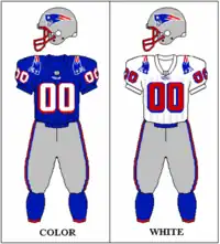 The Patriots underwent a complete identity overhaul before the 1993 season, starting with the introduction of the aforementioned "Flying Elvis" logo. The new uniforms consisted of a royal blue home jersey and a white away jersey.[50] The helmet was silver with the Flying Elvis logo and no additional striping.[50] Both uniforms used silver pants, originally with stripes designed to look like those flowing from the Flying Elvis, but these were changed to simple red and blue stripes after one season. When they debuted, both the home and away jerseys used red block numbers with a blue and white outline, but after one season the home uniforms switched to the now-familiar white with a red outline.[54]