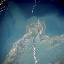 As quoted in NASA's website "it is typical of the wider deltas along the southeast coast of India (known as the Coromandel Coast).[30] The braided stream channels, broad floodplain, and extensive sandbars suggest that this part of the Krishna River flows through relatively flat terrain and carries a substantial amount of sediment, especially during the monsoon season."