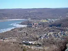 The portion of the bypass from Fort Montgomery to Cornwall-on-Hudson, with the exception of a one-mile (1.6 km) stretch northwest of Highland Falls, was constructed on a new alignment. It was built with four lanes and constructed along the sides of Storm King Mountain and other, smaller hills in the area. The high elevation of the roadway gave rise to a bevy of scenic, panoramic views that stretched for several miles into the distance; as a result, a fifth lane was added in some areas to allow motorists to stop and view the scenery. Like the section south of Fort Montgomery, the one-mile (1.6 km) stretch that utilized the original US 9W was widened to four lanes as well. Several interchanges were built along the route, including with NY 293 and NY 307.[29] The cutoff was opened to traffic from Fort Montgomery to NY 293 sometime in 1939 or 1940 and to Angola Road (CR 9) on September 26, 1940.[29][31] The last section, from Angola Road north to Blooming Grove Turnpike north of Cornwall-on-Hudson, was opened to traffic on May 31, 1941. US 9W was realigned to follow the cutoff[32] while its old route via the Storm King Highway became NY 218.[33]