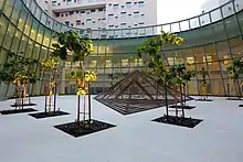 A permanent campus is on Saadiyat Island within a cultural district for the city that houses the Louvre Abu Dhabi and is also planned to house the Zayed National Museum and the Guggenheim Abu Dhabi museum.[18] Architect Rafael Viñoly was named master planner for the campus, designing it to combine elements of NYU's Greenwich Village environment and traditional Islamic villages.[19] The pedestrian campus consists of state-of-the-art classrooms, library, and information technology facilities; laboratories; academic buildings; student dormitories; faculty and residential housing; and athletic and performance facilities. The campus covers nearly 40 acres and also offers a number of public spaces, including theater and performance halls, an art gallery, conference center, and various retail offerings. The construction costs of the NYUAD Saadiyat Campus were entirely funded by the Abu Dhabi government, as will be the operating costs and any future expansions.[20]