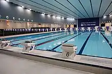 NYU Abu Dhabi's campus has modern, competitive level sports and recreation facilities including a 50-meter swimming pool, performance gymnasium and indoor track, fitness center, climbing wall, squash and racquetball courts, football pitch and multi-use fields, an outdoor track, tennis courts, as well as basketball and multi-use courts.[33]