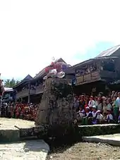 The Nias people are a community that continues living within the norms and practices of their indigenous culture. Customary law of the Nias people is generally referred to as fondrakö, which regulates all aspects of life from birth to death.[2] Historical evidence of megalithic structures and stone carvings that are found in the interior of the island proved that ancient Nias people practiced megalith culture. The caste system is also recognized in Nias society,[3] whereby the highest level out of the 12 levels in the Nias caste system is Balugu.[4] In order to reach this level of the caste, one must be able to carry out big festivals by inviting thousands of people and slaughtering thousands of pigs for several days.