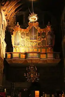 Two organs are installed in the cathedral. The main organ was built by the Steinmeyer firm in 1930, and was erected in the north transept.[9] It then had 125 stops. Installation of the Steinmeyer organ was commissioned in 1930 for the 900th anniversary of the Battle of Stiklestad. The organ was funded mostly by donations, particularly by Elias Anton Cappelen Smith. In 1962, the organ was heavily rebuilt and moved to the west nave. Many stops were removed; some of them were used to build a new choir organ. This organ was fully restored in 2014.[10][11]