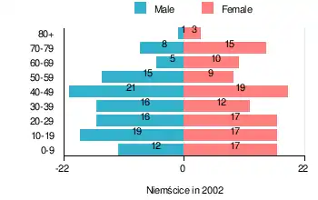 According to the 2002 Poland census, there were 232 people residing in Niemścice village, of whom 48.7% were male and 51.3% were female. In the village, the population was spread out, with 24.1% under the age of 18, 36.6% from 18 to 44, 22.4% from 45 to 64, and 16.8% who were 65 years of age or older.[1]