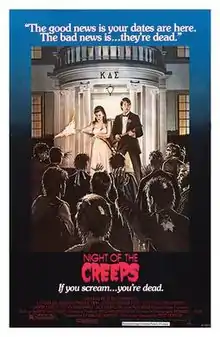 Night of the Creeps is a 1986 American science fiction horror comedy film written and directed by Fred Dekker in his feature directorial debut, starring Jason Lively, Jill Whitlow, and Tom Atkins. The film is an earnest attempt at a B movie and an homage to the genre. While the main plot of the film is related to zombies, the film also mixes in takes on slashers and alien invasion films. Night of the Creeps did not perform well at the box office, but it developed a cult following.[2]