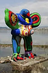 A critic has observed that Saint Phalle's "insistence on exuberance, emotion and sensuality, her pursuit of the figurative and her bold use of color have not endeared her to everyone in a minimalist age".[12] She was well known in Europe,[12] but her work was little-seen in the US, until her final years in San Diego. Another critic said: "The French-born, American-raised artist is one of the most significant female and feminist artists of the 20th century, and one of the few to receive recognition in the male-dominated art world during her lifetime".[13]
