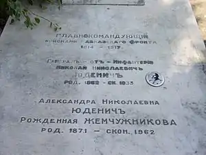 Nikolai Nikolayevich Yudenich (Russian: Никола́й Никола́евич Юде́нич; July 30 [O.S. July 18] 1862 – 5 October 1933) was a commander of the Russian Imperial Army during World War I. He was a leader of the anti-communist White movement in northwestern Russia during the Civil War.[1]