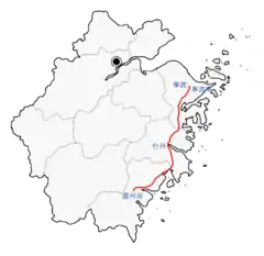 The Ningbo–Taizhou–Wenzhou railway follows the rugged but prosperous coast of Zhejiang. Major cities and counties along route include Fenghua, Ninghai, Sanmen, Linhai, Taizhou, Huangyan, Luqiao, Wenling, Yueqing, Yongjia, and Ouhai.[1] At Ningbo, the line joins the Xiaoshan–Ningbo railway and the Hangzhou–Ningbo passenger-dedicated line. At Wenzhou, the line joins the Wenzhou–Fuzhou railway.