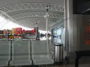 A new passenger terminal was opened on 8 October 2002 at a construction cost of RMB 770 million with an annual capacity of 3.8 million passengers. It can handle 1,700 passengers at maximum per hour. The departure lounge occupies 43,500 m2. The new apron occupies an area of 87,000 m2. The new terminal has 16 departure gates and 7 jetways. The new parking facility associated has 360 parking spaces.