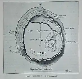 The island is an active volcano, and has erupted regularly since 1814.[2] In 1853, an eruption destroyed the village of ʻAhau and killed 25 people. An eruption beginning in August 1886 destroyed buildings and crops and created a new island in the lake.[3] Another in 1912 involved thirty active cones and threw lava to a height of 500 feet.[4] In 1929 an eruption destroyed the village of Futu,[5][6] cut off the harbor, and killed all the vegetation on the western slopes of the island. In December 1935 an eruption centered on the Ahofakatau and Hina craters caused the evacuation of Belani and Togamamao, and produced a two-mile wide lava-flow.[7] An eruption in September 1943 destroyed crops but caused no loss of life.[8]