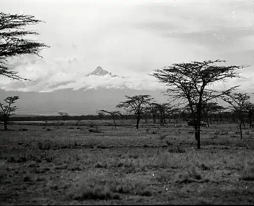 The English version was published in February 1952 as No Picnic on Mount Kenya (William Kimber, London), with the subtitle The Story of Three P.O.W.s' Escape to Adventure.[3][9] "No expedition on the mountain was ever a picnic" Vivienne de Watteville had written in her book Speak to the Earth (1935) about her 1929 visit to Mount Kenya.[10] Benuzzi's English title, perhaps suggested by this line of de Watteville's, refers to the expression 'It was no picnic', meaning 'It was hard going', but with an ironic allusion to the climbers' meagre P.O.W. rations. There have been at least eighteen English impressions, some published without the subtitle.[4] The Readers Union edition (1953), and the 'concise' version (ed. S. H. Burton) brought out by Longmans and Green in their 'Heritage of Literature Series' for schools (1960), helped popularise the book. The dust-cover of the English 2nd edition (Kimber, London, 1974) gives a 1970s' photograph of Benuzzi, Balletto and Barsotti and biographical updates; the 3rd English edition (Patrick Stephens Ltd, Wellingborough, 1989, Introduction by Rick Ridgeway), updates the biographical information. In 1999 Lyon Press republished the book with the subtitle A Daring Escape, a Perilous Climb.[4] In 2015 MacLehose Press brought out a new edition, with some twenty of Benuzzi's own watercolours from the expedition (all, for the first time, in colour), two contemporary photos of the Nanyuki POW camp, and a full translation of 'L'ignoto' (see above) from the Italian original.
