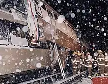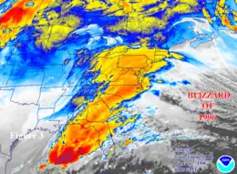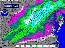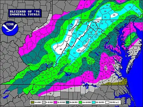 The North American blizzard of 1996 was a severe nor'easter that paralyzed the United States East Coast with up to 4 feet (1.2 m) of wind-driven snow from January 6 to January 8, 1996. The City University of New York reported that the storm "dropped 20 inches of snow, had wind gusts of 50 mph and snow drifts up to 8 feet high."[2] This storm was a classic example of a nor'easter, but the storm would not have been as historically significant without the presence of the arctic high pressure system located to the north of New York.[3] It was followed by another storm, an Alberta Clipper, on January 12,[4] then unusually warm weather and torrential rain which caused rapid melting and river flooding in the Northeast Floods later that month.[5] Along with the March Superstorm of 1993 and the January 2016 United States blizzard, it is one of only three snowstorms to receive the top rating of 5, or "Extreme", on the Northeast Snowfall Impact Scale (NESIS).[6]