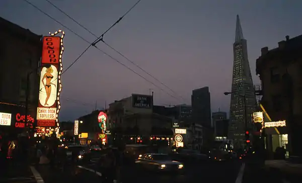 In the 1970s and 1980s Broadway was the location of many live music clubs, like the Stone, and a punk rock club called Mabuhay Gardens.[10]