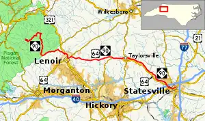 The western terminus is in Edgemont (in Caldwell County) at an intersection with Edgemont Road (SR 1420), Roseboro Road (Pisgah National Forest FR 981) and Edgemont Church Place (SR 1358). The first 8 miles (13 km) of the highway are quite curvy and unpaved.[2] NC 90 enters Lenoir on Valway Road (SR 1352). The route then turns left onto N. Main Street to then overlap with US 321 on Blowing Rock Boulevard. NC 90 then turn left, after 2 miles, onto Wilkesboro Boulevard to overlap with US 64 and NC 18. After about 2 miles, the route then turns right onto Taylorsville Road, keeping and overlap with US 64. After 40 miles, going through Taylorsville, NC 90 ends at US 21/US 64 in Statesville.