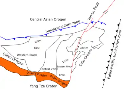| Late Triassic (240-210 million years ago) | Suture between the North China Craton and the Yang Tze Craton by deep subduction and continental collision. Isotopic data showed that at least part of the craton root was destroyed.[1][4][32] | Qinling-Dabie Orogen (South to Southwest of the Craton)[1][4][32] |
