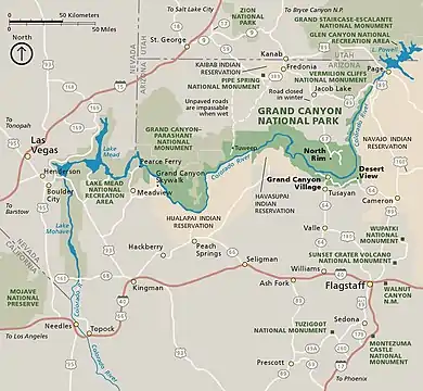 | Nearest city | Fredonia, Arizona (North Rim) Tusayan, Arizona (South Rim) |