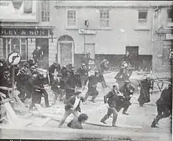 Loyalist crowds armed with petrol bombs, bricks, stones, sharpened poles and protective dustbin lids gathered at Dover and Percy Streets.[27] On Dover Street, the loyalist crowd was led by Ulster Unionist MP John McQuade.[28] They included a rowdy gang of loyalist football supporters who had returned from a match.[29] The loyalists began moving down these streets into the Catholic district, attacking Catholic homes and businesses. They were confronted by nationalists, who had hastily blocked their streets with barricades. Fighting broke out between the rival factions at about 11 pm.[30] Catholics claimed that B-Specials had been seen giving guns to the loyalists,[12] while journalists reported seeing pike-wielding loyalists standing among RUC officers.[31] On Percy Street, a loyalist opened fire with a shotgun,[27] and B-Specials helped the loyalists to push back the nationalists.[20]