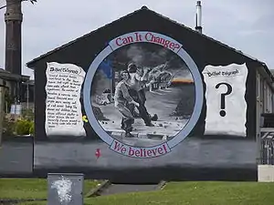 Catholics generally fled across the border into the Republic of Ireland, while Protestants generally fled to east Belfast.[63] The Irish Defence Forces set up refugee camps in the Republic – at one point the Gormanston refugee camp held 6,000 refugees from Northern Ireland.[63]