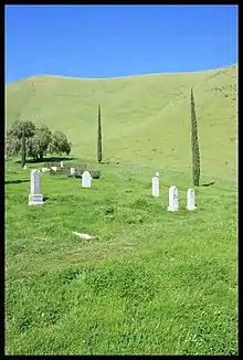 The town was home to many Welsh miners.[3] In 1885 the Black Diamond Coal Mining Company moved all the coal miners from Nortonville to another of the Company's mines at Black Diamond, Washington Territory.[3][6] The Nortonville mine was so deep that it acted as a drain for the surrounding mines, and when the owners of the other mines refused to contribute to the cost of pumping out the water, the company simply shut down and moved its operations.[8] Currently what is left behind at Nortonville is a deserted area. The brick foundation of the mine's hoisting works, remnants of the railroad bed, and an old cemetery[3] are all that remain. The cemetery is known as the "Rose Hill Cemetery," which was named for Emma Rose, daughter of Alvinza Hayward, who was president and chief stockholder of the Black Diamond Coal Mining Company.[9] In the 1940s Mrs. Rose donated the cemetery to the county.[9]