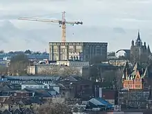 In the 18th century, the castle mound was being used by the city's inhabitants as a soil quarry and rubbish dump. Norwich Justices of the Peace petitioned the House of Commons for the fee simple of the castle, shirehall and surrounding grounds to be vested in them. This was granted by Act of Parliament on 12 July 1806, thereby ending more than 700 years of royal ownership.[28] The authorities soon deemed Soane's prison inadequate and it was extensively remodelled by Wilkins's son, also named William Wilkins. The building work was completed by 1827.[29] Models and plans of the site show that Wilkins retained Soane's U-shape structure within the keep but demolished Soane's adjoining building and the 1749 rebuilt Elizabethan Shirehall or Sessions House on the north side of the keep.[30] Prisoner accommodation was extended across the top of the castle mound by new wings radiating from a central gaoler's house.[31][32] A new Shirehall was designed by Wilkins in Tudor style and built at the north east foot of the castle hill in Market Avenue. Prisoners would be escorted from the castle cells, down spiral stairs and along a foot tunnel to the crown court in the shirehall.[33][34]
