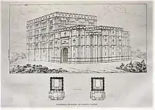 G. T. Clark, a 19th-century antiquary and engineer, described Norwich's great tower as "the most highly ornamented keep in England".[43] It was originally faced with Caen stone over a flint core.[14] The keep is some 95 ft (29 m) by 90 ft (27 m) and 70 ft (21 m) high, and is of the hall-keep type, entered at first floor level through an external structure called the Bigod Tower. The exterior is decorated with blank arcading. Castle Rising, also in Norfolk, is the only other comparable keep in this respect.[14] Internally, the keep has been gutted so that nothing remains of its medieval layout. The uncertainty surrounding the keep's arrangement has led to scholarly debate. What is agreed on is that it had a complex domestic arrangement, with a kitchen, chapel, a two-storey high hall, and 16 latrines.[44] The original Norman bridge over the inner ditch was replaced in around 1825.[14][45]
