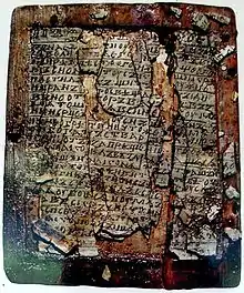The Novgorod Codex (Russian: Новгородский кодекс) is the oldest book of Kievan Rus', unearthed on 13 July 2000 in Novgorod. It is a palimpsest consisting of three bound wooden tablets containing four pages filled with wax, on which its former owner wrote down dozens, probably hundreds of texts during two or three decades, each time wiping out the preceding text.