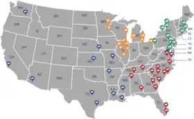 Nuclear reactors within the Contiguous United States as of October 2021; marker colors indicate respective administrative Regions of the Nuclear Regulatory Commission