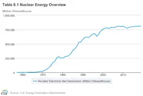 Despite the problems following Three Mile Island, output of nuclear-generated electricity in the US grew steadily, more than tripling over the next three decades: from 255 billion kilowatt-hours in 1979 (the year of the Three Mile Island accident), to 806 billion kilowatt-hours in 2007.[71] Part of the increase was due to the greater number of operating reactors, which increased by 51%: from 69 reactors in 1979, to 104 in 2007. Another cause was a large increase in the capacity factor over that period. In 1978, nuclear power plants generated electricity at only 64% of their rated output capacity. Performance suffered even further during and after Three Mile Island, as a series of new safety regulations from 1979 through the mid-1980s forced operators to repeatedly shut down reactors for required retrofits.[72] It was not until 1990 that the average capacity factor of US nuclear plants returned to the level of 1978. The capacity factor continued to rise, until 2001. Since 2001, US nuclear power plants have consistently delivered electric power at about 90% of their rated capacity.[73] In 2016, the number of power plants was at 100 with 4 under construction.