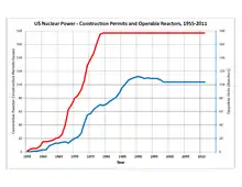 US reactor construction permits issued and operating nuclear power reactors, 1955–2011 (data from US EIA)