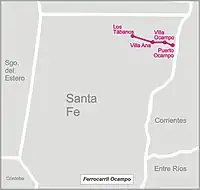 The railway line was strategically designed to join some of the city's industries such as the "Carlota" sawmill,[3] the "Manolo Ocampo" sugar mill (later "Ingenio Arno")[4] and the "Don Emilio" distillery,[5] all around Villa Ocampo,[1] to Puerto Ocampo, on an arm of the Paraná River called "Paraná Miní".[6]
